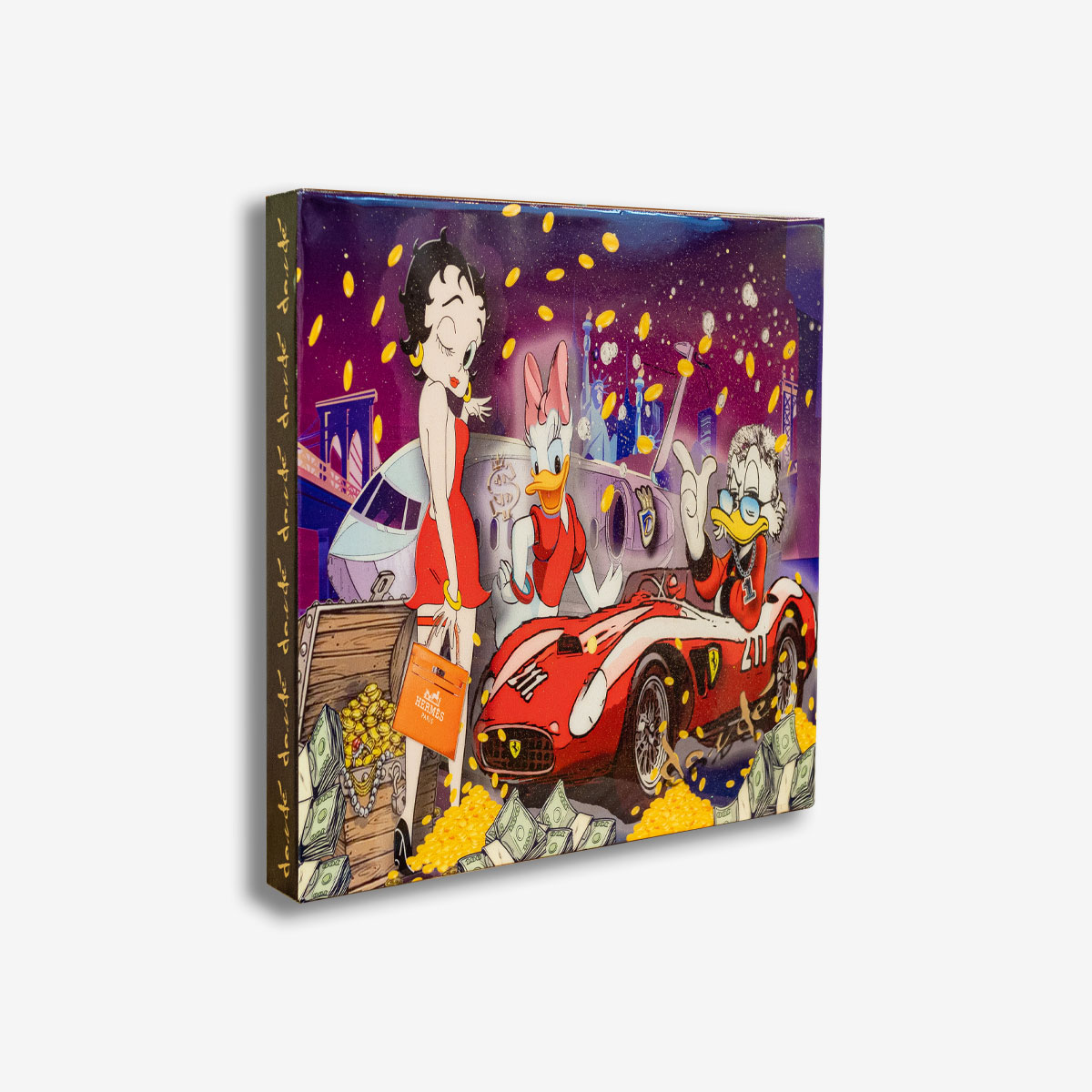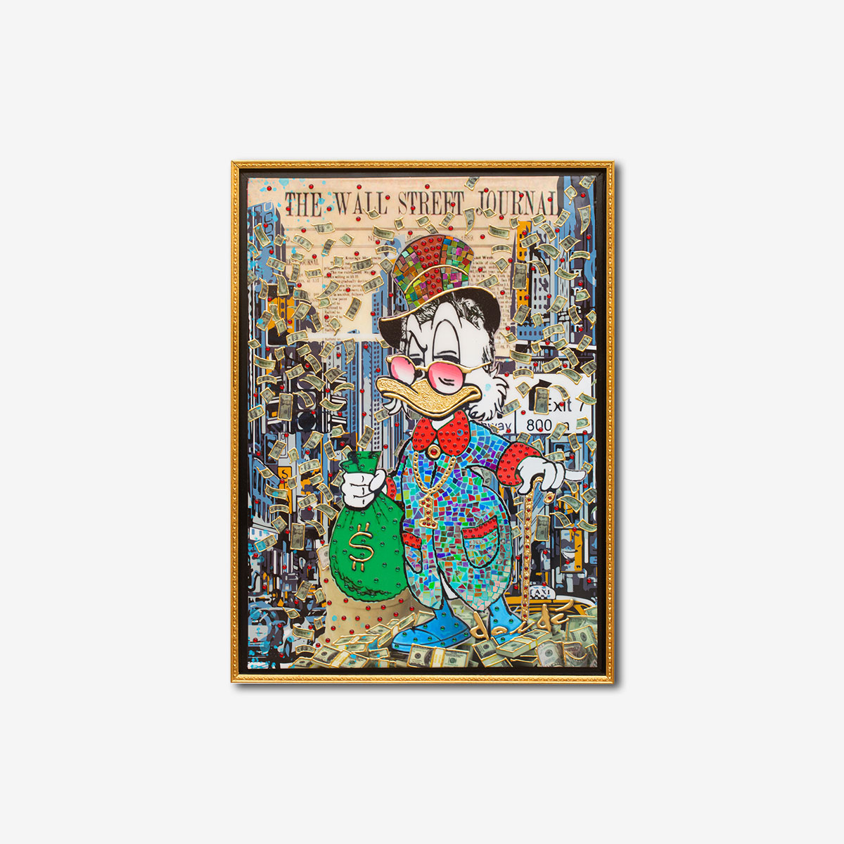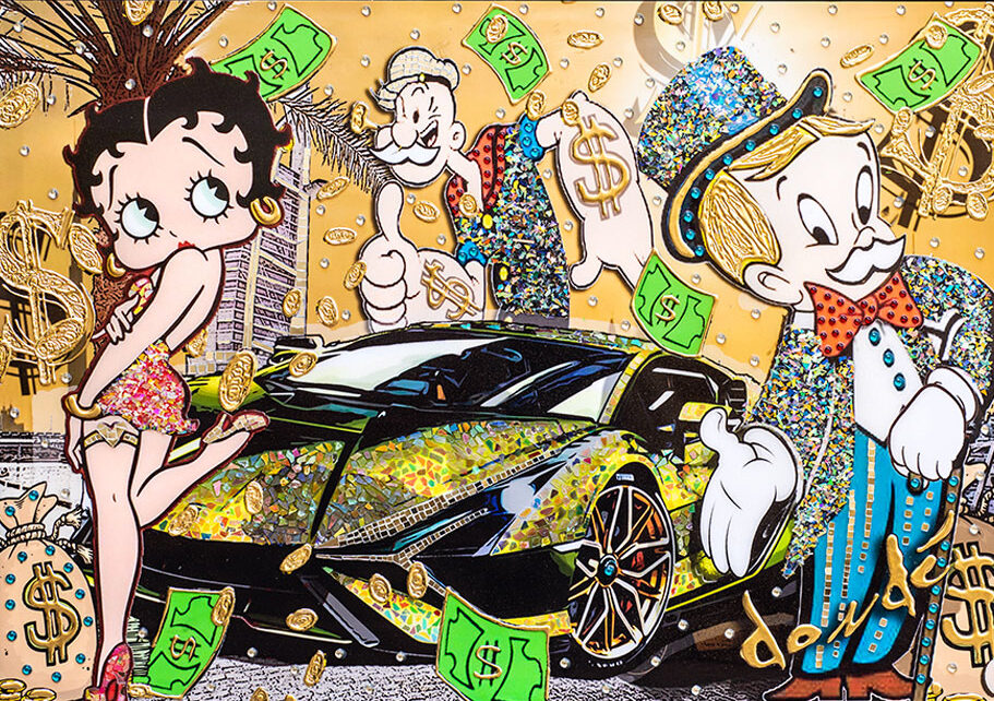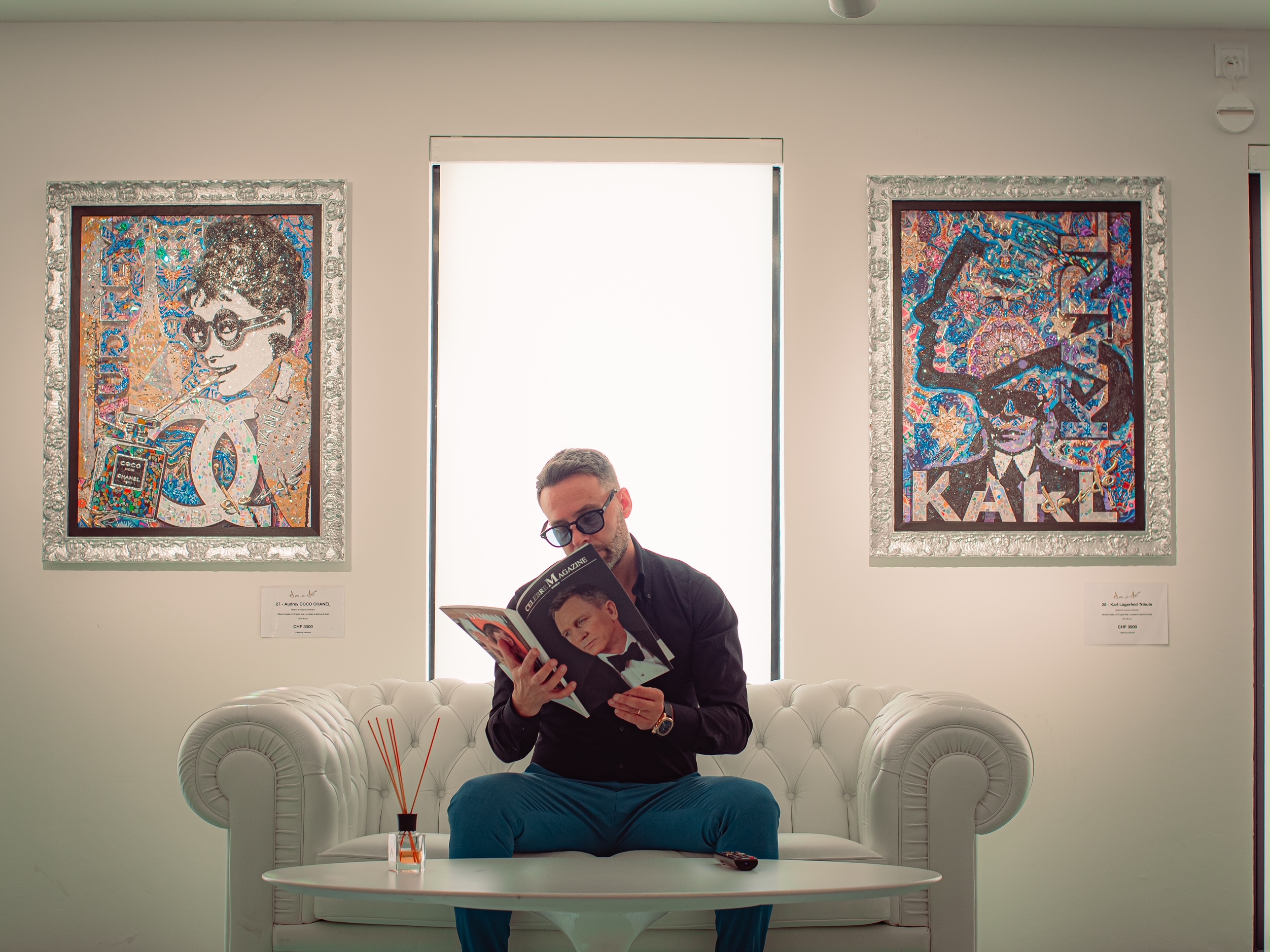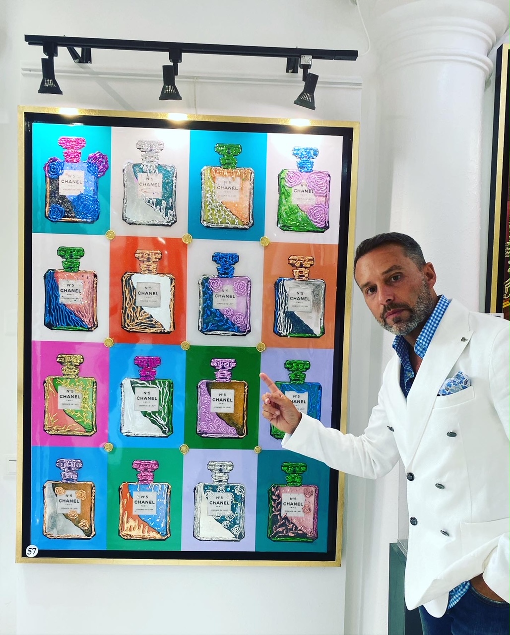 The internationally renowned Artist exhibited in several cities all over the world, enjoying big success and curiosity everywhere thanks to his works studded with gold, colours and precious gems in a unique glitter between luxury and Pop Art.